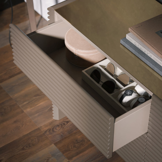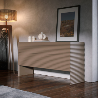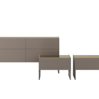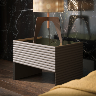Patsy Night - мебель для спальни от итальянской мебельной фабрики Tonin Casa. Фасады и боковины имеют декоративную фрезеровку в виде горизонтальных линий. Комод и прикроватные тумбы можно заказать в бежевом цвете, в сером цвете или в любом цвете по раскладке RAL. По желанию столешницу можно декорировать бронзовым зеркалом.