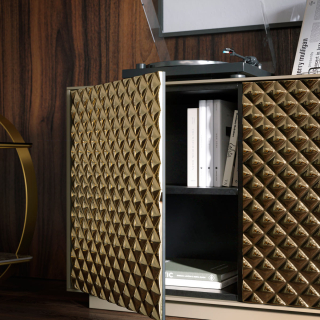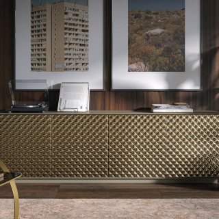 Роскошный сервант Luce от фабрики Tonin Casa имеет четыре распашных дверцы и скрытый внутренний ящик. Корпус изготовлен из матового лакированного дерева. Зеркальные фасады имеют объемный декоративный узор - ромбы. Для заказа доступен вариант в бронзовом или дымчатом зеркале fumè.