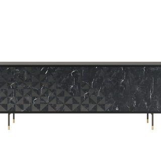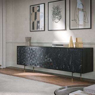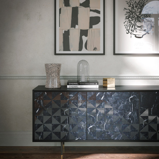 Новая модель итальянской мебельной фабрики Tonin Casa. Роскошный сервант Apogeo с дверцами из натурального мрамора Grigio Carnico. Мрамор на дверцах имеет различные варианты шлифовки, что создает элегантный рисунок. Корпус серванта и внутренние полки выполнены из дерева - Черный Ясень. Ножки металл - Серый Карбон. Четыре распашных фасада открываются нажатием.