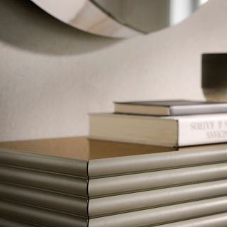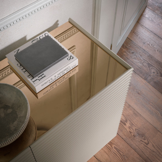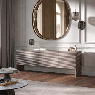 Patsy - сервант от итальянской мебельной фабрики Tonin Casa. Модель доступна в двух вариантах: на высоких ножках и без ножек. Фасады и боковины имеют декоративную фрезеровку в виде горизонтальных линий. Сервант можно заказать в бежевом цвете или в цвете шампань. По желанию столешницу можно декорировать бронзовым зеркалом.