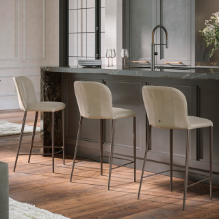 Элегантные барные стулья Bustier. Ножки выполнены из металла. На спинке декоративная простёжка. Обивка эко-кожа, ткань, натуральная кожа или нубук.