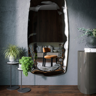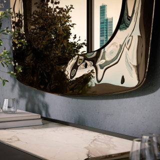 Eos - зеркало из новой коллекции итальянской мебельной фабрики Tonin Casa. Зеркало имеет объемную зеркальную изогнутую раму. Представлено в двух размерных вариантах: квадратное и прямоугольное настенное зеркало. На выбор два цветовых решения: бронза или серый дымчатый цвет.