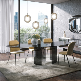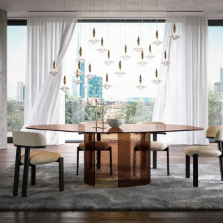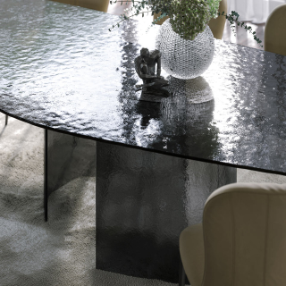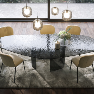 Ablos - изящный и современный вариант обеденного стола. Конструкция стола полностью выполнена из декоративного кованного стекла. Столешница и основание имеют сложные формы, за счет чего модель становится еще более эффектной. Доступно три цветовых варианта: Дымчатое стекло, Янтарное стекло и Бронзовое стекло. Стол можно заказать в двух различных размерах.