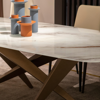 Новинки от итальянской мебельной фабрики Tonin Casa - обеденный стол THUNDER. Стол имеет необычное стальное основание, которое доступно в широком спектре цветов. Столешница может быть изготовлена из декоративного стекла с принтом, керамики, мрамора или дерева. Так же столешница представлена в различных формах: прямоугольная, со скругленными углами или сложной формы. Для заказа доступны разнообразные размерные варианты.